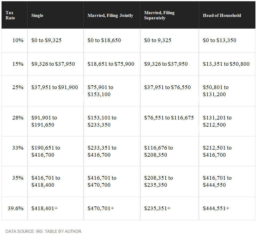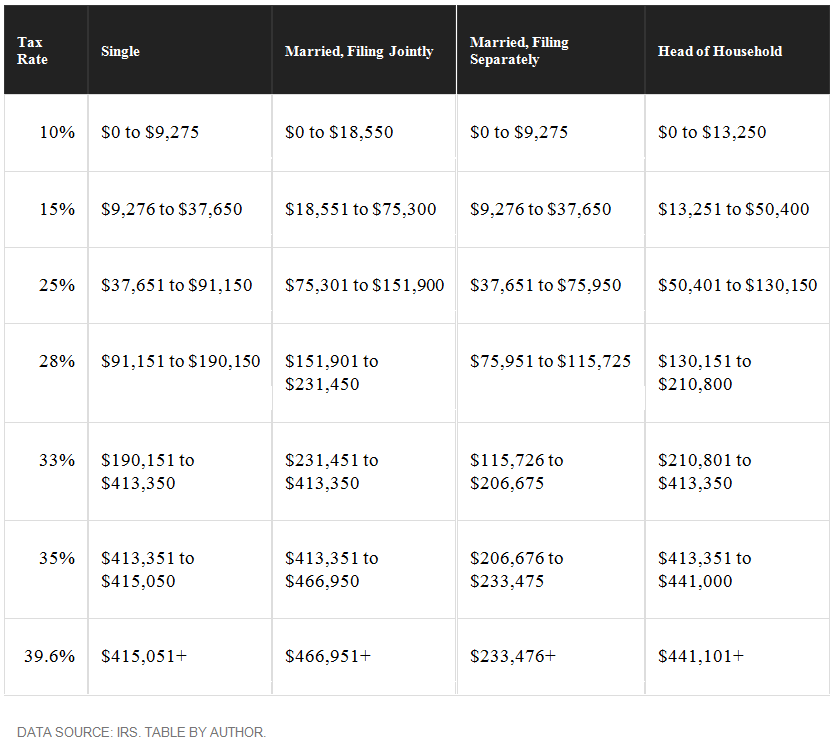 Here’s what the 2016 tax bracket looks like now (the bracket you’ll be using when preparing your taxes in a few months):