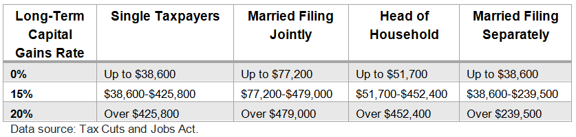Also, under the new tax law, the three capital gains income thresholds don’t match up perfectly with the tax brackets. Under previous tax law, a 0% long-term capital gains tax rate applied to individuals in the two lowest marginal tax brackets, a 15% rate applied to the next four, and a 20% capital gains tax rate applied to the top tax bracket.